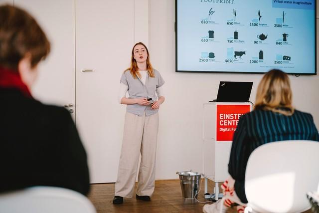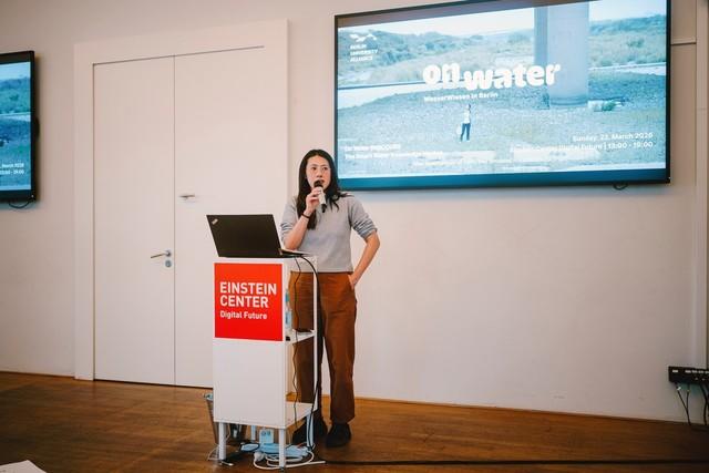 Back inside in the Einstein Future Digital Center, participants explored the exhibition “Politics of Design – Per/Forming Critique & A.I. Ambiguous Intelligence”[1]. The critical student works strongly connect to the theme of the day, addressing virtual water and the water consumption of AI, technology, and digital infrastructures. The program continued with three brief talks setting the scene for a rich exchange in a World Café setting.