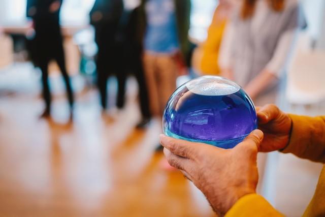 [image 7 ©Alexander Rentsch: Passing the piece from one person to the next valued everyone’s participation. Holding the intriguing glass sculpture while sharing thoughts became a gesture of presencing and care.]